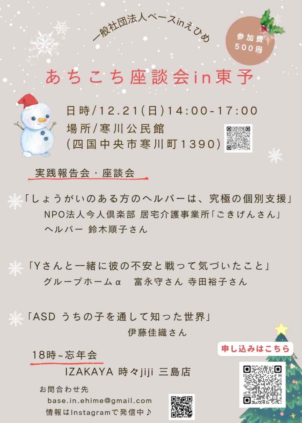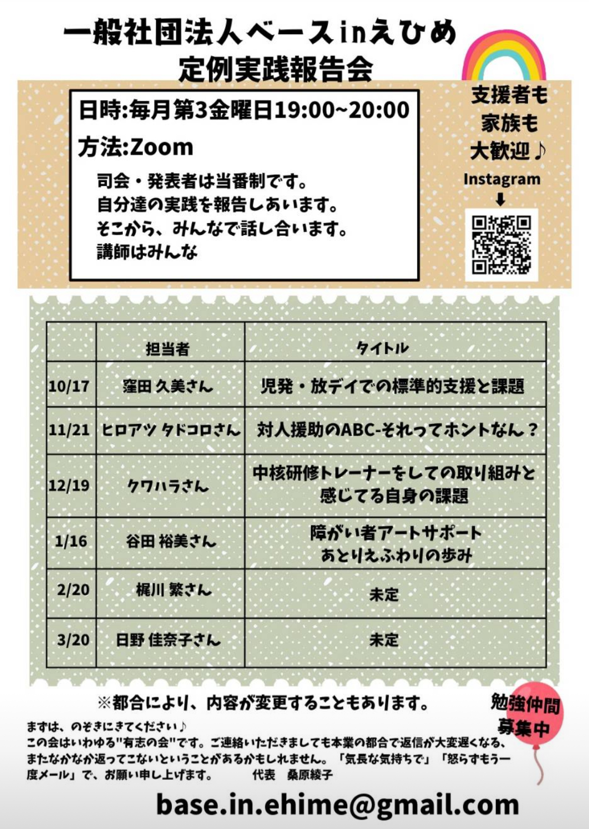 自閉症支援ベースinえひめとして活動していましたが、このたび「一般社団法人ベースinえひめ」となりました。現在新しいチラシなど作成中です!次のイベントは「あちこち座談会in東予」です!